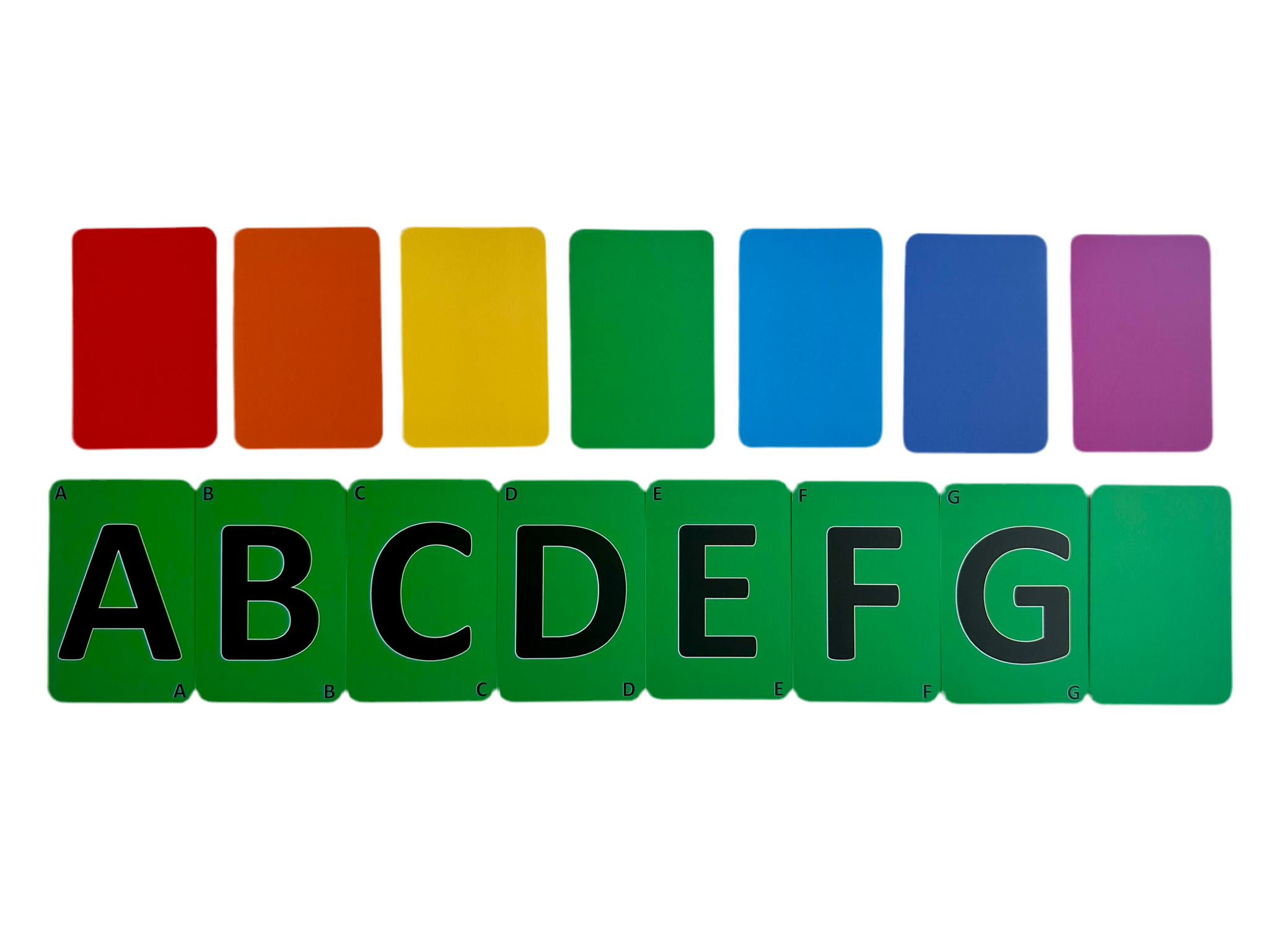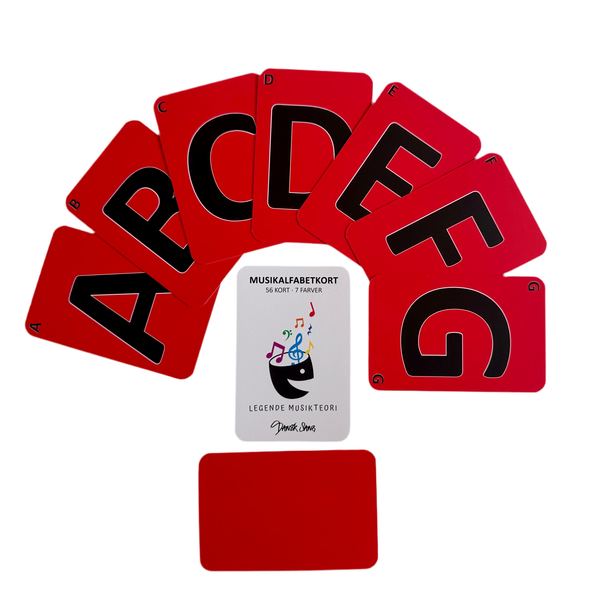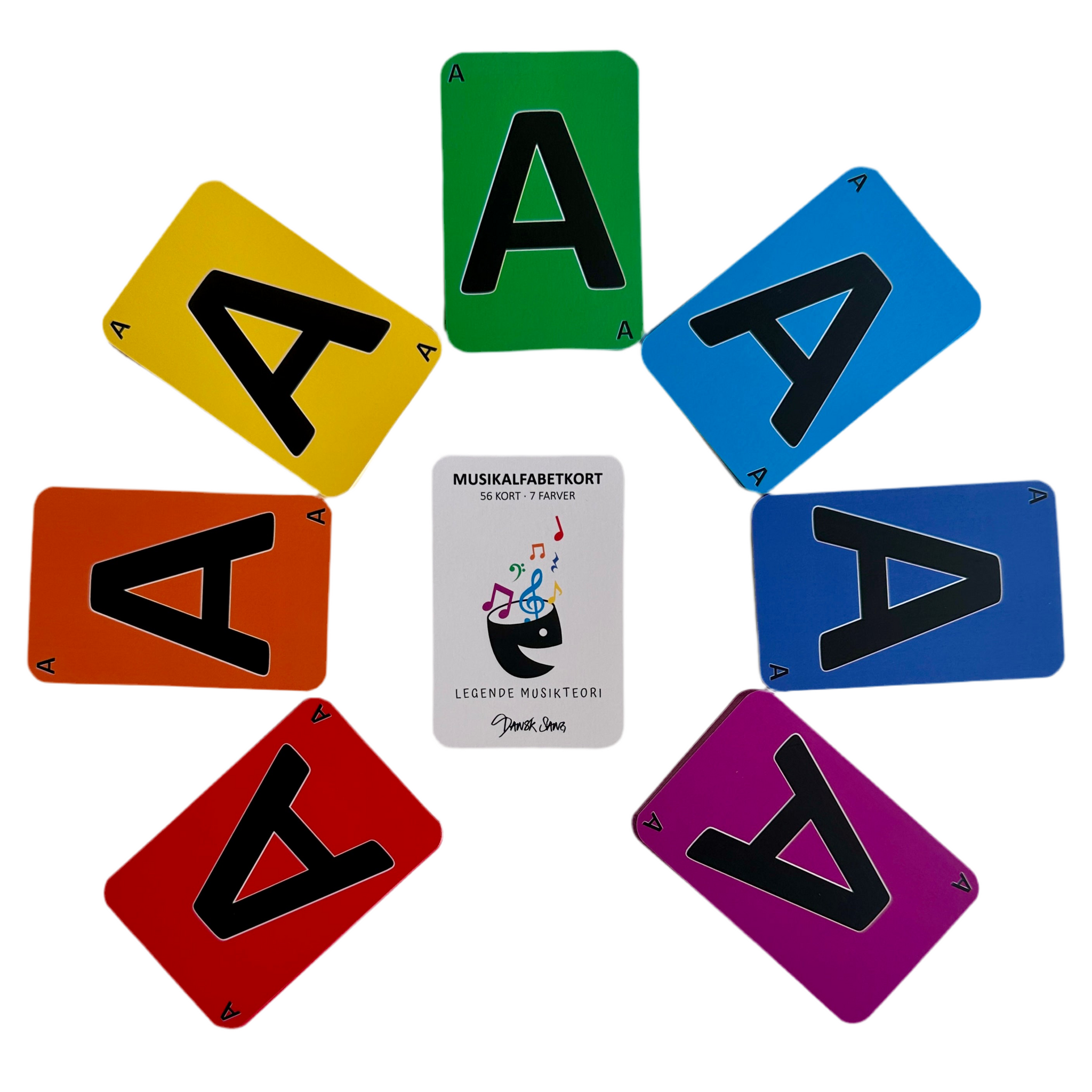 Musikalfabetkortene hos Legende Musikteori inkluderer 56 spillekort i regnbuens farver. Hver farve er printet med de 7 stamtoner (A B C D E F G) samt et blankt kort.